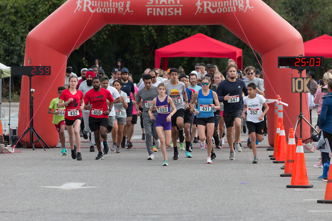People running across the starting line at the 5 km Don Doan Dash.